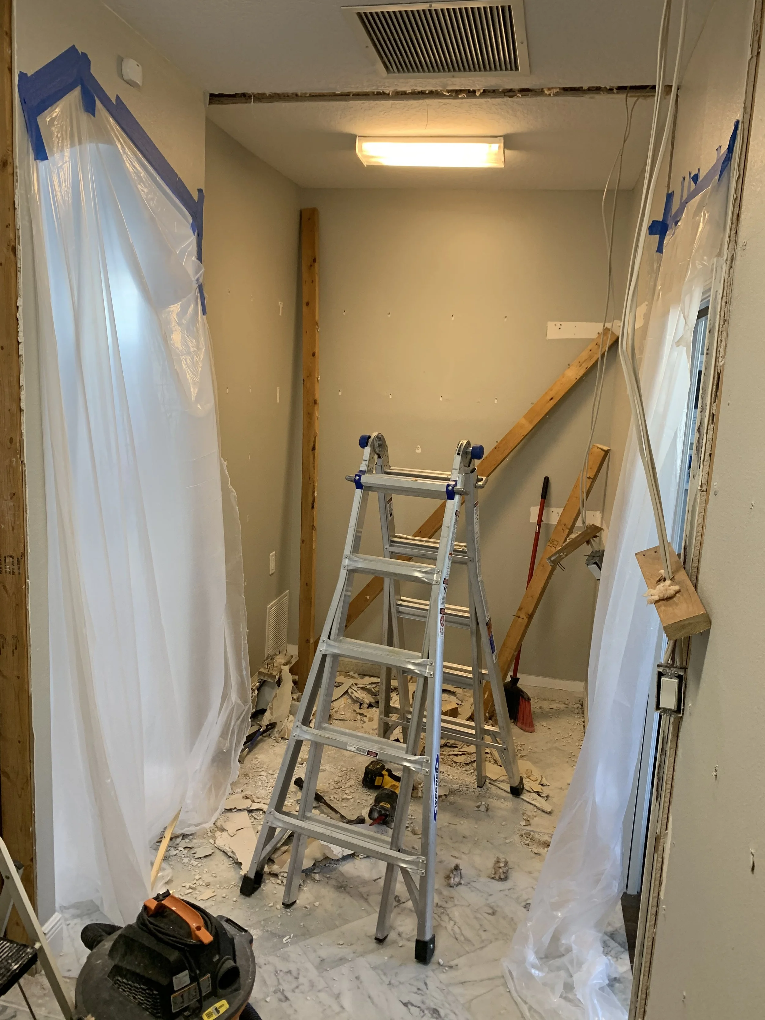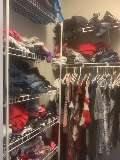 This sprawling home in Winter Garden has a spacious primary suite and spa bath - but the closets were a disappointment - two separate standard 6’x8’ walk-ins with wire shelves and bifold doors located across from eachother in a short hall between the bedroom and bath. The client hated the clunky doors that opened into the hall, the lack of space and the design disconnect from the rest of the suite.