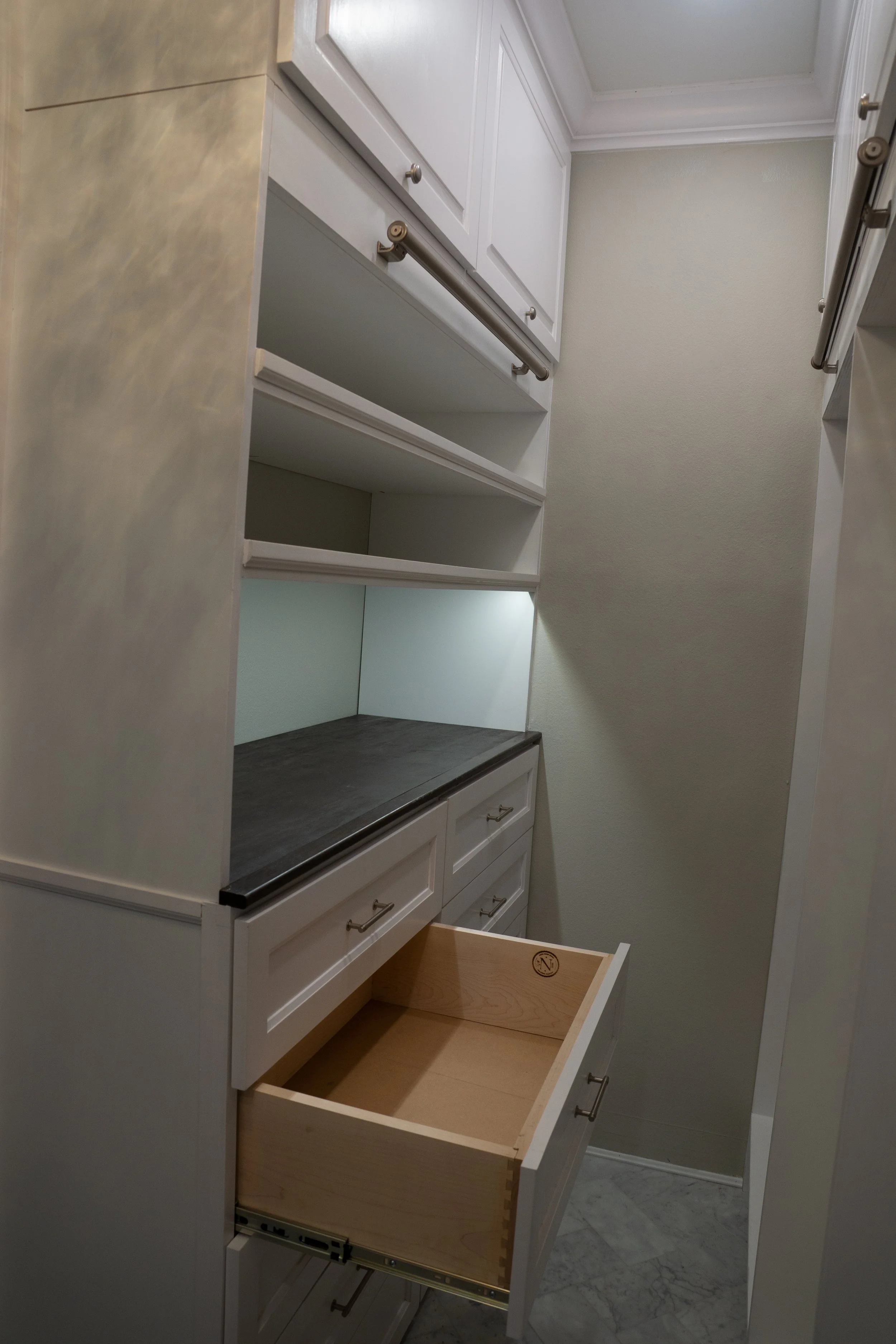 Our client requested that on her side the hanging space be reduced in favor of an additional accessories dresser unit with a recessed LED lit mirror and convenience electrical outlet.
